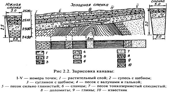 Канава – выработка трапецеидального сечения с шириной по основанию около 0,6 м, глубиной до 3 м и протяженностью до 100-150 м. Канавы целесообразно отрываться в ручную и при помощи землеройных машин. Канавы, также дают возможность получать туже информацию, что и шурфах.