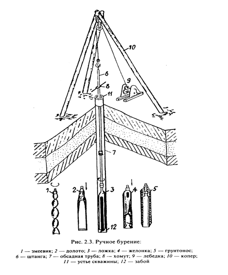 Бурение – это вид полевых работ, при котором проводиться изучение геологического разреза, т.е. для выявления последовательности залегания пластов, их мощности, состава, плотности, консистенции, влажности, водоносности, а также отбора образцов пород и последующего испытания в лабораторных условиях. Оно подразделяется на ручное и механическое бурение. Выбор способа бурения зависит от состава проходимых пород, от назначения и глубины бурения, от условий производства работ. При выборе способа бурения особое внимание уделяется качеству и виду отбираемых образцов пород и экономической эффективности способа.