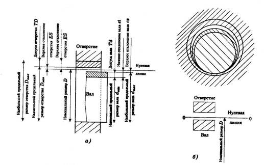 Основные термины и определения установлены ГОСТ 25346—89. Номинальный размер — размер, который служит началом отсчета отклонений и относительно которого определяются предельные размеры. Обозначается номинальный размер отверстия — D (D) вала - dH (d)(рис.1,а)