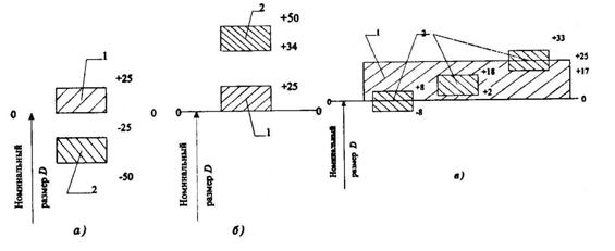 Для упрощения допуски можно изображать графически в виде полей допусков (рис. 1, б). При этом ось изделия (на рис. 1, б не показана) всегда располагают под схемой. Поле допуска — поле, ограниченное верхним и нижним отклонениями. Поля допуска определяются значением допуска и его положением относительно номинального размера. При графическом изображении поле допуска заключено между двумя линиями, соответствующими верхнему и нижнему отклонениям относительно нулевой линии. Нулевая линия — линия, соответствующая номинальному размеру, от которой откладывают отклонения размеров при графическом изображении допусков и посадок. Если нулевая линия расположена горизонтально, то положительные отклонения откладывают вверх от нее, а отрицательные — вниз.