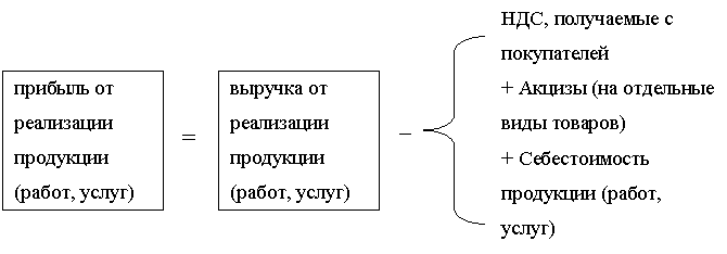 1. прибыль от реализации товарной продукции – определяется путем вычета из общей суммы выручки от реализации продукции в действующих ценах (без НДС и акцизов) затрат на производство и реализацию товарной продукции, включаемых в себестоимость продукции (рис. 1.2).