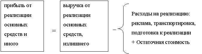 3. прибыль (или убытки) от реализации основных фондов и другого имущества – рассчитывается как разность между выручкой от реализации этого имущества (за вычетом НДС, акцизов) и остаточной стоимостью по балансу, скорректированной на коэффициент, соответствующий индексу инфляции (рис.1.3).