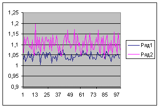 Рис. 1. Данные имитационного моделирования необходимого коэффициента покрытия пенсионных обязательств. Метод «закрытого фонда». Условные когорты численностью 5000 (ряд 1) и 1000 (ряд 2).