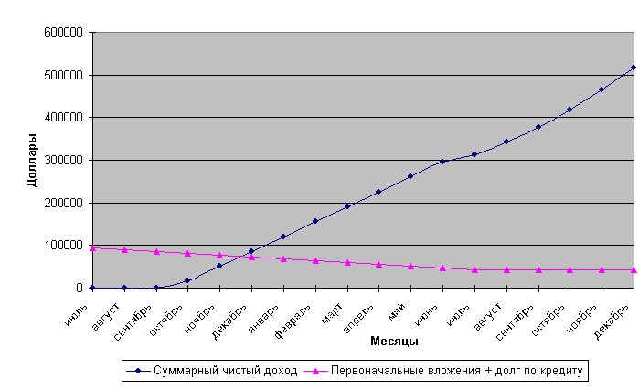 На основе данных таблицы № 13 построим график окупаемости проекта. Как видно из графика, проект окупится через 4,5 месяца, т.е. когда произойдет пересечение двух кривых.