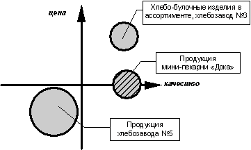 Рассмотрим далее сегментирование рынка по характеристикам цена-качество, которые приведены на рисунке 7. Данный рисунок показывает наличие свободного сегмента хлеба высокого качества, который несколько дороже обычного хлеба и примерно равен цене хлебобулочных изделий в ассортименте.