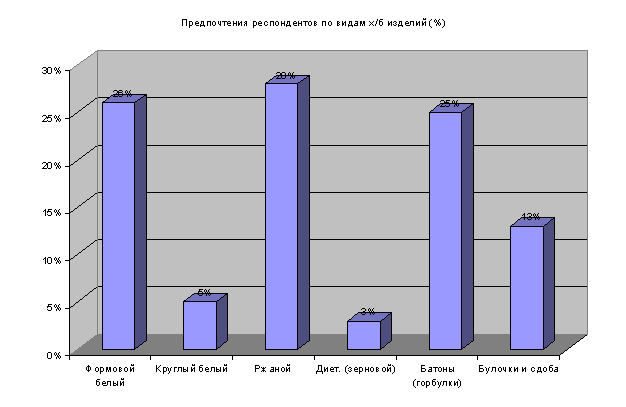 Что касается предпочтений покупателей по видам хлебобулочных изделий, то наибольшей популярностью пользуются: уральский подовый – 28%, формовой белый – 26%, батоны и горбулки – 25%, булочки и сдоба 13%, круглый белый – 5%, диетический зерновой – 3%.
