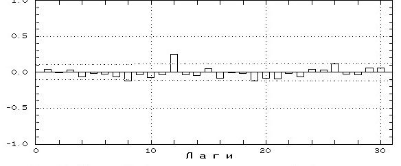 В общем случае можно предполагать, что в рядах, состоящих из отклонений от тренда, автокорреляции нет. Например, на рис. 4 представлен график АКФ для остатков, полученных от сглаживания ряда, очень напоминающий процесс «белого шума». Однако нередки случаи, когда остатки (случайная компонента h ) могут оказаться автокоррелированными, например, по следующим причинам [1, 172]: