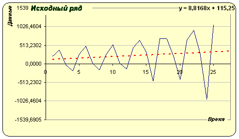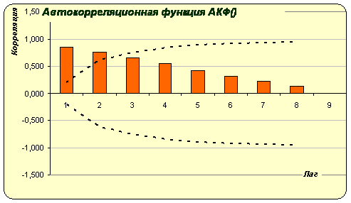 На диаграммах показаны: исходный ряд (сверху) и автокорреляционная функция до лага 9 (снизу). На нижней диаграмме штриховой линией обозначен уровень «белого шума» - граница статистической значимости коэффициентов корреляции. Видно, что имеется сильная корреляция 1 и 2 порядка, соседних членов ряда, но и удаленных на 1 единицу времени друг от друга. Корреляционные коэффициенты значительно превышают уровень «белого шума». По графику автокорреляции видим наличие четкого тренда.