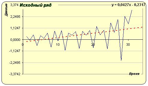 Видим наличие автокорреляции 4-го порядка, что соответствует корреляции данных, отдаленных на год. Автокорреляцию первого порядка не имеем.