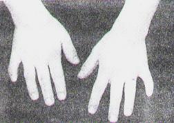Рука обычно имеет «паловидную» форму. Пальцы рук широкие и плоские. Между укороченными пальцами могут встречаться межпальцевые кожные перепонки - так называемые «плавательные перепонки» (рис.№10).