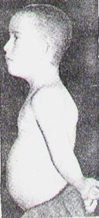Вследствие гипотонии мышц брюшной стенки живот выпячен (рис.№12). Определяется низкое расположение пупка. Нередки пупочные грыжи (из-за слабости пупочного кольца) и грыжи белой линии живота. У детей, страдающих болезнью Дауна, часты запоры. У больных детей в первые годы жизни не редко отличается отставание развития наружных половых органов; в период полового созревания оно нормализуется.