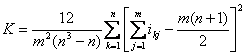 Коэффициент конкордации характеризует связь между несколькими признаками, измеряемыми в порядковой шкале. Имеется выборка объемом n из m –мерной генеральной совокупности x = (x1,x2…xm), признаки xj которой можно измерить в порядковой шкале, где ikj-ранг k-го наблюдения j-го признака, k=1,… ,n, или номер члена вариационного ряда.