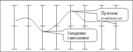 Неравномерное повышение и снижение самооценки. Представим себе, что имеется более-менее устойчивая самооценка, и вдруг «провал», потом подъём, но в целом она более-менее равномерна. «Западение» самооценки – это, как правило, признак проблемы, неблагополучия, обычно – это то, что вы ищите. Западение – это признак того, что на фоне более-менее устойчивого настроения наблюдается его понижение в связи с ситуативной актуализацией негативных воспоминаний. Пик по другой шкале в такой ситуации можно рассматривать как признак компенсации (Рис. 4). Компенсация – это то, чем человек пытается затушевать, спрятать от самого себя и окружающих те отрицательные переживания, которые возникают, когда он не свободен в выборе поведения. (Здесь всегда как бы звучит: «Но вот зато…»).