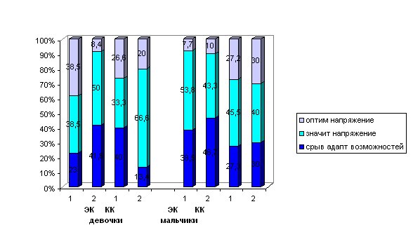 Оценка адаптационных возможностей учащихся экспериментального класса, показала, что у девочек к концу учебного года наблюдается резкий спад адаптивных возможностей и значительное напряжение регуляторных механизмов. Возможно, это вызвано чрезмерной ответственностью их к учебе и личностными особенностями характера, т.к. у девочек КК наблюдается улучшение. Тем более, что программа обучения в обоих классах одинакова (рис 13).