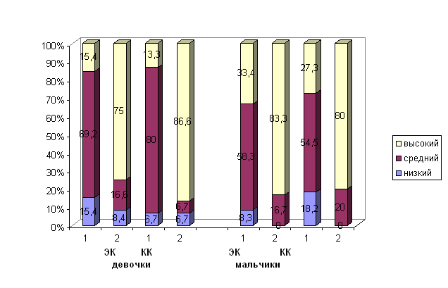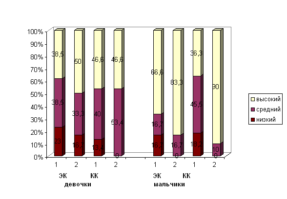 Все психофизиологические показатели у учащихся обоих классов улучшились, что является результатом возрастных изменений, а также влиянием процесса обучения на развитие когнитивной сферы. Но в тоже время количество учащихся с высоким уровнем КП к концу года уменьшается, кроме мальчиков КК, за счет увеличения числа детей со средним уровнем. Возможно это результат проявления умственного утомления в конце учебного года (рис. 15).