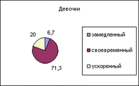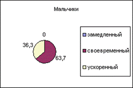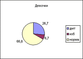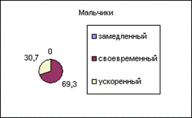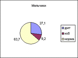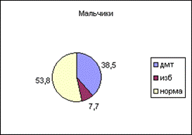 Индивидуальная оценка гармоничности развития выявила определенные отклонения от нормы, которые проявились в дефиците массы тела, в основном у мальчиков (38,5%) (рис.3). Это связано с периодом 1-го вытягивания, который заканчивается в 7 лет. В связи с тем, что мальчики
