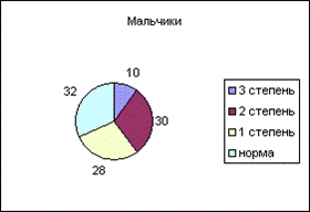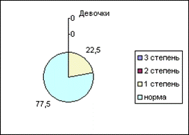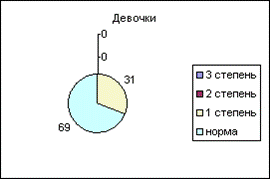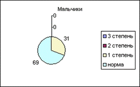 Проведение обследования свода стопы с целью выявления наличия плоскостопия показало, что 67% мальчиков и 31% девочек уже имеют плоскостопие I и II степени. Эти нарушения развития опорно-двигательного аппарата также можно еще исправить.