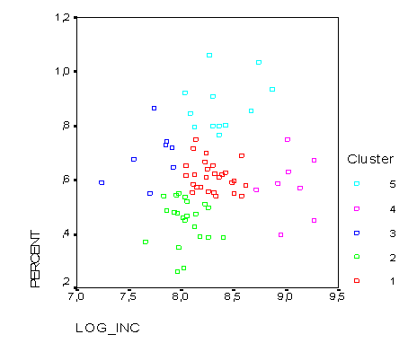 Таким образом, можно заключить, что по выбранным переменным субъекты Российской Федерации можно разбить на пять кластеров. Из особенностей такого разбиения можно выделить следующие: