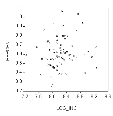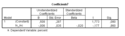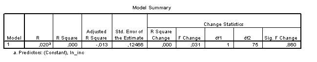 Как видно из точечной диаграммы рассеивания предполагаемая зависимость между долей студентов и доходом их родителей, скорее всего, отсутствует. Чтобы убедиться в этом оценим формально модель, посмотрим на уровни значимости коэффициентов и объясняющую силу модели в целом.