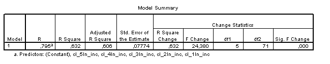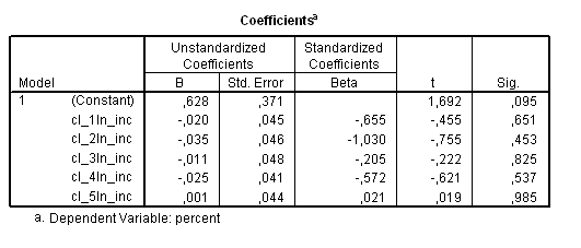 Поскольку константа в регрессии (4) сама по себе не несет никакого экономического смысла, а нам необходимо оценить регрессию именно с учетом принадлежности регионов выделенным кластерам, то мы будем использовать в качестве регрессоров произведения логарифма денежных доходов и соответствующей фиктивной переменной, отвечающей за принадлежность наблюдения определенному кластеру.