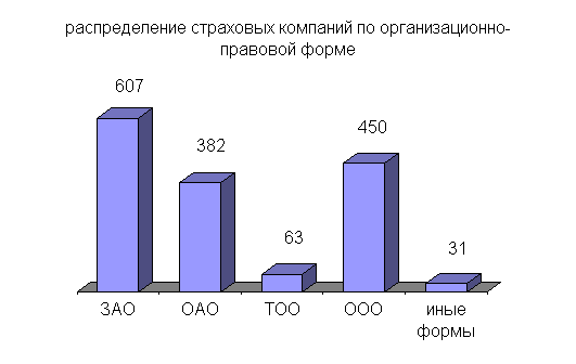 На Рис. 4 изображена столбиковая диаграмма, отражающая распределение страховых компаний по организационно-правовой форме. Высота каждого столбика отражает количество компаний, принадлежащих той или иной форме.