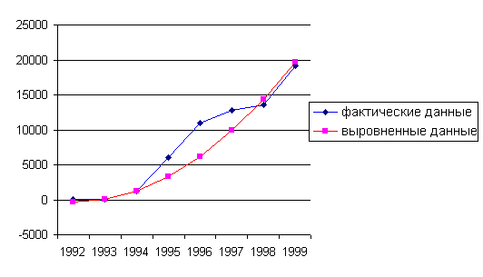Расчетные данные для каждого года приводятся в последней колонке таблицы 8. Мы видим некоторые расхождения между суммой выровненных и фактических данных. Это происходит из-за округления величин, а также наличия более высоких степеней в системе уравнения для определения параметров параболы, чем, например, прямой. Для более наглядного рассмотрения рассчитанных показателей, воспроизведем графически результаты, полученные аналитически.