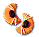 Кофейные полумесяцы 80 штук по 35 ккал. Тесто: 150 г размягченного сливочного масла, 75 г сахарного песка, 2 желтка, сок и натертая цедра 1 апельсина, 1 ч.ложка растворимого кофе, 200 г. муки, 1 неполная ч. ложка разрыхлителя, 50 г очищенного, мелко натертого миндаля. Украшение: 75 г сахарной пудры, 1-2 ст. ложки концентрированного молока, 1 ч.ложка растворимого кофе, орешки в шоколаде, 25 г. миндаля, нарезанного дольками. Тесто. Масло взбить до кремо-образной массы, постепенно подмешивать сахар и желтки. Затем добавить цедру апельсина и апельсиновый сок, растворимый кофе, смешанную с разрыхлителем и просеянную муку, миндаль и замесить тесто. Завернуть тесто в полиэтилен и положить в холодильник на 2 часа. Затем раскатать тесто в полиэтилене до толщины 1/3 см, вырезать формочками полумесяцы и выложить их на противень. Выпекать в предварительно разогретой духовке при 180° ок. 10мин. Снять с противня и остудить. Украшение. Просеянную сахарную пудру смешать с концентрированным молоком и небольшим количеством растворимого кофе. Полученной массой обмазать печенье и украсить миндальными дольками и оре-шками в шоколаде.