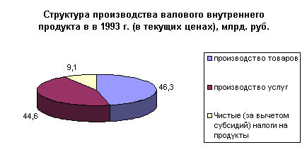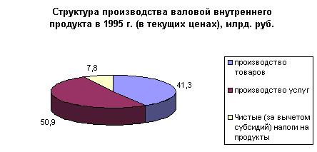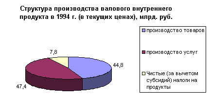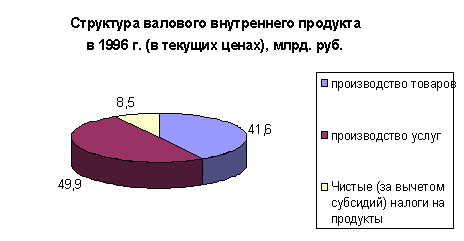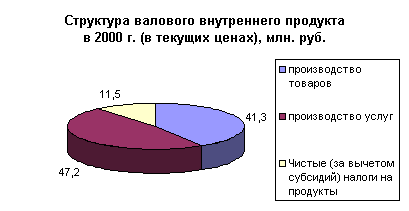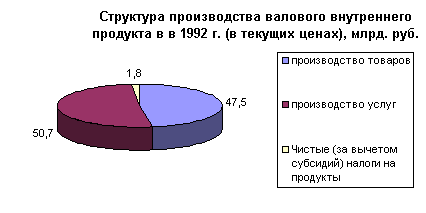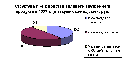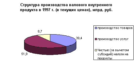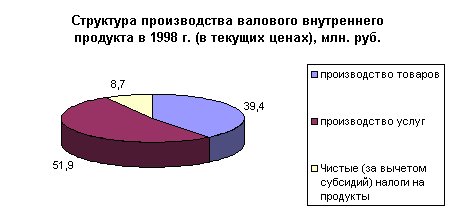 В структуре производства валового внутреннего продукта за период с 1992 по 2000 год наблюдается тенденция к уменьшению удельного веса производства услуг и товаров. Доля услуг в 1997 году составила 51,9 % против 50,7 % 1992 году, а доля производства товаров уменьшилась с 47,5 % в 1992 году до 39,4 % в 1997 году. В 1998 году значительных изменений в структуре производства валового внутреннего продукта. Также в структуре произведенного валового внутреннего продукта в 1997 году значительно сократился удельный вес практически всех отраслей экономики, производящих товары (на 2,2%). Это связано с повышение доли производства услуг при сокращении спроса на продукцию этой сферы деятельности явилось, прежде всего, отражением спада деловой активности в остальных отраслях. С другой стороны, рост доли услуг обусловлен также позитивными структурными изменениями в этом секторе экономики. Растет, в частности, доля связи, торговли, операций с недвижимостью, финансово-кредитных и страховых услуг и других их видов, имеющих прежде всего рыночный характер. В 1999 и 2000 годах наблюдается рост объема производства товаров и снижение роста производимых услуг. А что касается соотношения доли товаров и услуг в структуре производства валового внутреннего продукта, то оно не претерпело значительных изменений. В 1999 году производство товаров составило 40,7 %, а услуг 49 %. В 2000 году доля производимых товаров в структуре производства валового внутреннего продукта равна 41,3 %, а доля услуг 47,2.