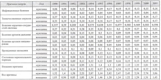 В таблице 2 представлены данные, указывающие на влияние смертей нерезидентов на ожидаемую продолжительность жизни москвичей в разных возрастных группах и на «вклад» различных причин смерти в снижение этого показателя. В 1990 г влияние смертей нерезидентов на среднюю продолжительность жизни определялось прежде всего сердечно-сосудистыми заболеваниями - 0,36 года у мужчин и 0,27 года у женщин. Через пять лет, на пике роста общей смертности, среди молодых мужчин влияние смертей нерезидентов на ожидаемую продолжительность жизни выросло; при этом основную роль играли травмы и отравления -1,4 года у мужчин и 0,37 года у женщин. В 2001 г. влияние нерезидентов очень близко к таковому в 1995 г. как в целом, так и по отдельным классам причин.