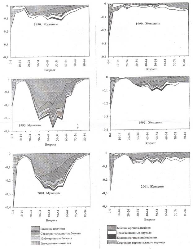Рис 2 Влияние смертей нерезидентов на ожидаемую продолжительность жизни москвичей в различных возрастных группах