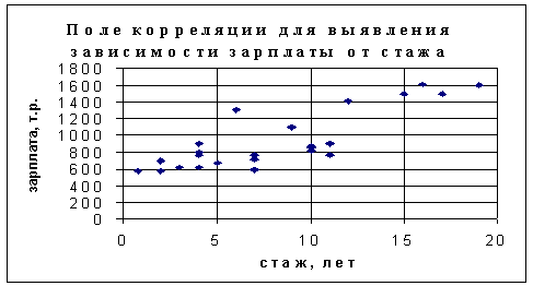 Для предварительного выявления наличия связи и раскрытия её характера, применяют графический метод. Используя данные об индивидуальных значениях признака-фактора и соответствующих ему значениях результативного признака, строится в прямоугольных координатах точечный график, который называют «полем корреляции». Для данного примера поле корреляции имеет следующий вид ( см. рис. 2.1).