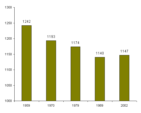 Все послевоенные переписи населения демонстрировали неуклонное сокращение "женского перевеса" в населении, число женщин на 1000 мужчин в населении в целом неуклонно сокращалось: в 1959 - 1242; в 1970 - 1193; в 1979 - 1174; в 1989 - 1140. Перепись 2002 года впервые показала рост этого соотношения (рис.3).