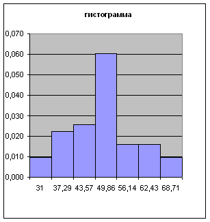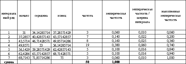 | значение функции распределения на левом конце интервала | значение функции распределения на правом конце интервала | теоретическая частость - разность значений интегральных функций распределений на концах интервалов | теоретическая частота | квадрат разности эмпирической и теоретической частоты деленной на теоретическую частоту |