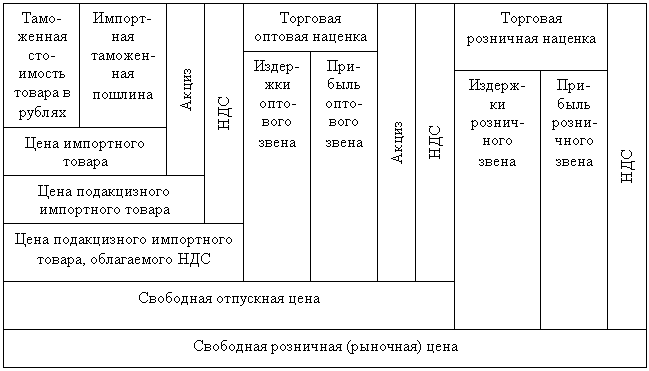 В ценах первых трех видов имеется элемент, покрывающий расходы торговли и обеспечивающий ее прибыльность ( рисунок 3.,4.). Это торговая наценка (ТН) – часть продажной цены, предназначенная для возмещения издержек обращения (транспортные расходы, оплата труда торговых работников, расходы по аренде и содержанию помещений, реклама и т.д.) и обеспечения прибыли торговых предприятий. При государственном регулировании торговая надбавка устанавливается в процентном отношении к отпускной цене (как правило, от 15 до 25%). Во всех остальных случаях она складывается под воздействием спроса и предложения на данный вид товара. Торговая наценка дифференцируется по группам товаров и по местонахождению торговых организаций. Сумма наценок по всем проданным товарам называется реализованным наложением (РН) или валовым доходом (ВД). Валовой доход – это разница между продажной и покупной стоимостью реализованных товаров (без НДС, акциза, налога с продаж).