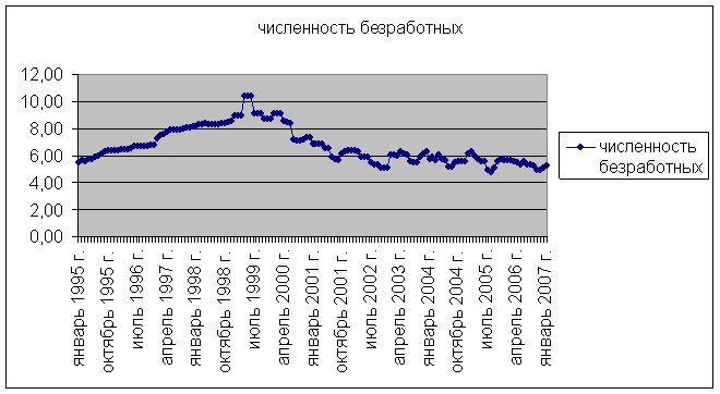 можно видеть, что численность безработных росла до 99г., а потом снижалась. Это связано с оздоровлением экономики, вызванным кризисом 98г. поэтому будем изучать безработицу начиная с июня 99, когда она достигла своего максимума. На этом временном интервале она представима на графике