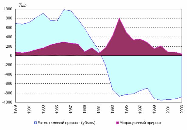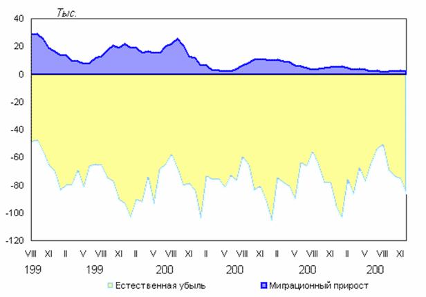 Рис 2. Компоненты прироста (убыли) населения России, тысяч человек