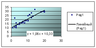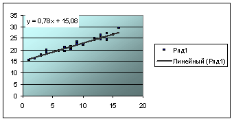 Форму связи между факторным и результативным признаком можно установить, построив в прямоугольной системе координат всё множество пар значений признаков. По оси абсцисс откладываются значения факторного признака х, по оси ординат – значения признака у. Такое построение называется – полем корреляции. Линия на графике, изображающая тенденцию в изменении результативного признака при возрастании факторного, называется линией регрессии. Она ищется в виде уравнения примой линии:
