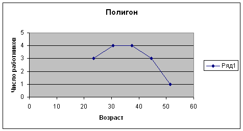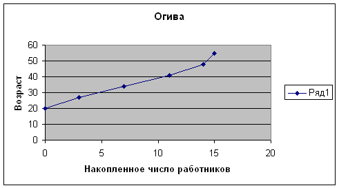 Известно, что возрастной состав работников компании “Акварель” состоит из 15 человек. Возрасты работников равны (лет): 39, 48, 20, 25, 35, 55, 33, 37, 46, 28, 31, 45, 30, 41, 26. Построить вариационный ряд (предварительно объяснив выбор и этапы его построения). По вариационному ряду построить полигон, гистограмму (с построенным на ней полигоном), кумуляту, огиву.