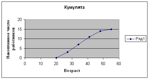 | № | Группа работников по возрасту | Число работников с данным возрастом | Накопленное число работников |