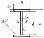 Сечение составной сварной балки состоит из трех листов: вертикального – стенки (1) и двух горизонтальных – полок (2).