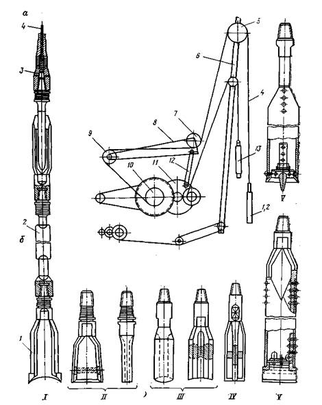 / — инструмент в сборе; //, /// и IV — типы долота; V — желонка