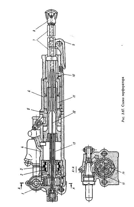 Для примера рассмотрим конструкцию пневматического перфоратора ПР-ЗОл (рис. 11), который состоит из цилиндра 4, ствола 6, и задней головки 1, стянутых двумя болтами, и буро-держателя 9 (при смене бура 7 скобу буродержателя отводят в сторону). К задней головке прикреплена рукоятка, с помощью которой молоток поддерживается во время работы. Внутри цилиндра молотка размещены золотниковая коробка 2 с золотником 3, поршень-ударник 5 и поворотный механизм, состоящий из храпового (геликоидального) стержня 13 с подпружинными собачками 14. Стержень проходит через храповую буксу 15, золотниковую коробку и направляющую спиральную гайку поршня-ударника, входя внутрь последнего. При работе молотка сжатый воздух подается в золотниковую коробку и в зависимости от положения золотника попеременно поступает в одну из полостей цилиндра— спереди или сзади поршня-ударника, заставляя его совершать возвратно-поступательные движения. Двигаясь вправо, поршень-ударник совершает рабочий ход с ударом в конце по забурнику. При этом закрепленная в полости поршня гайка, скользя своими витками по винтовой нарезке стержня 13, поворачивает его. Двигаясь затем влево, поршень-ударник поворачивается уже сам относительно стержня, который в этом случае остается неподвижным, удерживаясь храповым механизмом, и увлекает за собой бур посредством поворотной буксы, верхняя часть 11 которой связана с поршнем подвижным шлицевым соединением, а в нижнюю часть 10 входит граненый хвостик бура. Образующаяся в процессе проходки буровая мука выдувается из шпура сжатым воздухом или вымывается водой, поступающими на дно шпура по промывочной трубе 12 в канале бура. При бурении с продувкой полная очистка шпура от муки осуществляется периодическим включением интенсивной продувки. Забойный конец бура 8 армируется пластинами твердых сплавов ВК-8, ВК-10, ВК-Н и ВК-15. Бурение пород средней крепости более эффективно бурами, оснащенными пластинами ВК-8, а крепкие ВК-15.