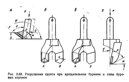 Различают следующие элементы резцов (рис. 12,г): угол приострения пера ε, угол заострения лезвия резца β, передний угол заточки у, задний угол заточки α. Конструкция резца и его геометрия должны обеспечивать при минимальном износе получение высокой скорости бурения. Практика показывает, что оптимальный угол приострения е, удовлетворяющий указанным условиям, составляет 120°. Задний угол заточки а также влияет на производительность бурения. Существует зависимость, которая показывает, что скорость бурения при постоянном давлении на резец пропорциональна касательной заднего угла заточки (по Шеферду): v =ktgα, где v — скорость бурения; k — постоянная бурения, равная wπD, w — частота вращения резца, D — диаметр резца.