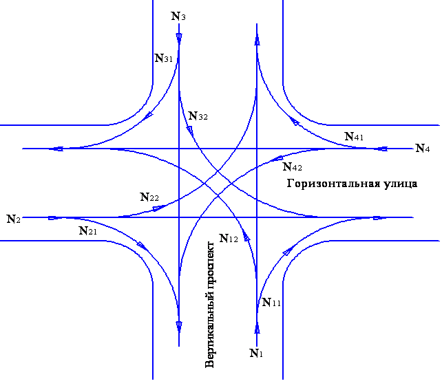 Рисунок 1–План перекрестка с обозначением транспортных потоков