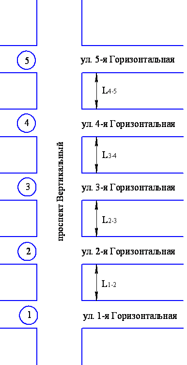 Рисунок 2–Схема магистрали: цифры в кружках обозначают номер перекрестка; L1-2, L2-3 и т. д.–расстояние между перекрестками
