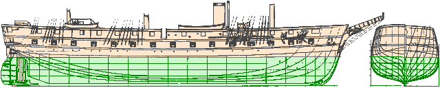 Рис.22. Корпус винтового фрегата «Олег», построенного в Кронштадте в 1858-1860 гг. «Олег» был одним из последних добротных деревянных кораблей русского военно-морского флота. Двухлопастный гребной винт имел диаметр 5,8 м. При движении под парусами винт отсоединялся от гребного вала и втягивался в колодец, устроенный в кормовом подзоре.