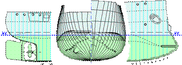 Рис.24. Крейсер «Аврора». В корпусе крейсера реализованы мореходные качества аналогичные обводам миноносца. Их суть – это непротивление штормовой стихии. Хорошо виден завал бортов в средней части корпуса. На верхней палубе отсутствуют большие непрерывные площади. Довольно любопытно устроена внутрикорпусная прочная и непрерывная палуба, погибь которой образует второй внутренний борт. Очевидна технологическая сложность корпуса, в обводах которого нет ни одной прямой линии. Интересно, как в те времена проектировали бы корпус корабля, если б внутренние объемы не определялись громоздкостью судовых машин?