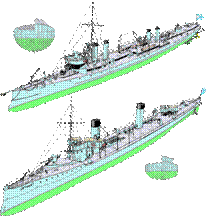 Рис.25. Порт-Артурские эскадренные миноносцы «Внимательный» типа «Форель», построенный во Франции (сверху), и «Бдительный» типа «Кит», спущенный на воду в Германии (снизу). Немецкий проект («Кит») ориентирован на плавание и решение боевых задач в условиях умеренного волнения Балтийского моря и обладает относительно малой осадкой, что требуется для базирования в мелководных балтийских портах и устьях европейских рек, а у французского проекта отсутствует даже открытая верхняя палуба, то есть корабль должен основное время находиться в открытом штормовом море.