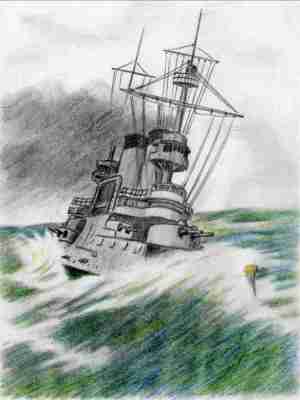 Рис.30. Эскадренный броненосец «Цесаревич». Основным признаком хорошей штормовой мореходности является плавность качки, свидетельствующая об отсутствии резкого воздействия волн на корпус корабля. Все другие свойства корпуса, как заливаемость палуб, рыскание или ходкость и маневренность на тихой воде, могут быть оптимизированы во вторую очередь. К транспортным паровым судам, ввиду громоздкости и малой мощности главного двигателя, не предъявлялось специальных требований по ходкости в штормовом океане. Судно имело заостренный вертикальный форштевень и округлую нависающую над водой корму. В случае штормовой погоды судно должно было взять курс носом на волну и удерживаться на нем с помощью двигателей до улучшения погоды