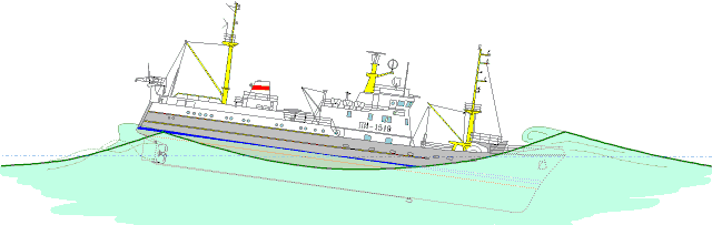 В основном режиме работы рыболовного траулера, при выборке трала на курсе по волне, даже в случае умеренного волнения регулярно ощущаются удары слеминга также и под широкой транцевой кормой, которые к тому же сопровождаются продольной вибрацией корпуса. Главной особенностью рыболовных судов является необходимость работы экипажа на верхней палубе при умеренных штормах, при которых либо еще продолжается рыбалка, либо сети поднимаются на борт с последующим креплением «по штормовому». В данном случае достижение незаливаемости бака, которое имеет следствием усиление всех видов качки, приходит в явное противоречие с обеспечением безопасности работы на кормовой траловой палубе.
